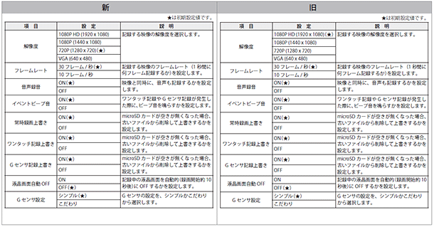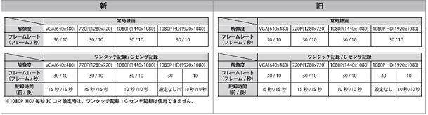 ワンタッチ記録・G センサ記録を使用される旧初期設定の製品をご購入のお客様には大変ご迷惑をおかけ致しますが、解像度を「1080P」「720P」「VGA」のいずれかへ設定変更いただくか、フレームレートを「10フレーム/秒」に設定変更していただきますようお願い申し上げます。