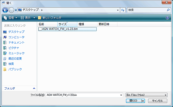 手順9.でデスクトップに保存した、ファームウェア(AGN WATCH_FW_v1.23.bin)を選択し、「開く」をクリックしてください。