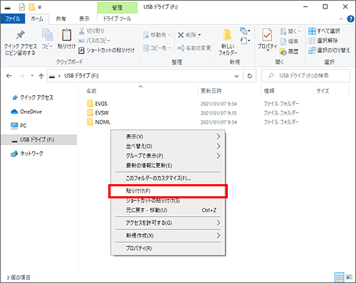 マウスの右ボタンをクリックし、メニューから「貼り付け」を選択してください。