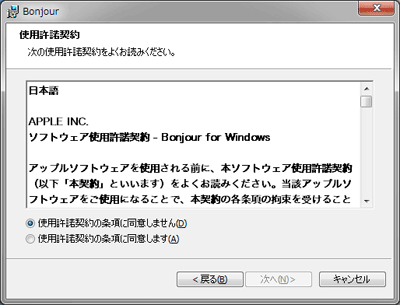Bonjourインストール関する使用許諾契約を良くお読みいただいた上で『使用許諾契約の条件に同意します』をチェックし、『次へ』ボタンをクリックしてください。