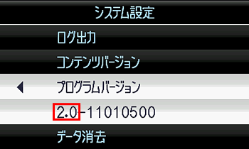 メインメニューの「設定」を選択→設定画面にて「システム設定」を選択→システム設定画面にて「プログラムバージョン」を選択