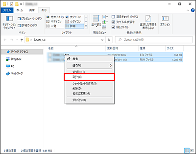 1つのファイルを選択した状態で、マウスの右ボタンをクリックし、メニューから「コピー」を選択してください。