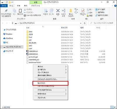 マウスの右ボタンをクリックし、メニューから「貼り付け」を選択してください。