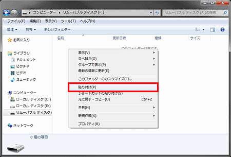 手順7.で開いたmicroSDカードのウィンドウ内のフォルダやファイル以外の場所で、マウスの右ボタンをクリックし、メニューから「貼り付け」を選択してください。