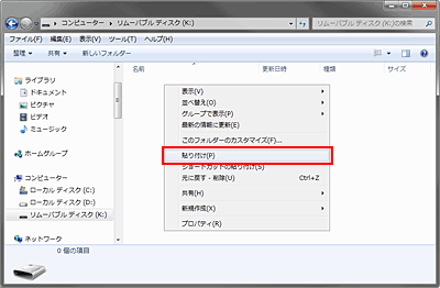 マウスの右ボタンをクリックし、メニューから「貼り付け」を選択してください。