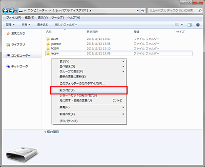 マウスの右ボタンをクリックし、メニューから「貼り付け」を選択してください。
