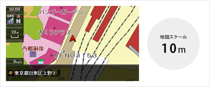 10mおよび25m のスケールにおいて、詳細市街地図収録エリアでは、詳細な市街地図が表示されます。