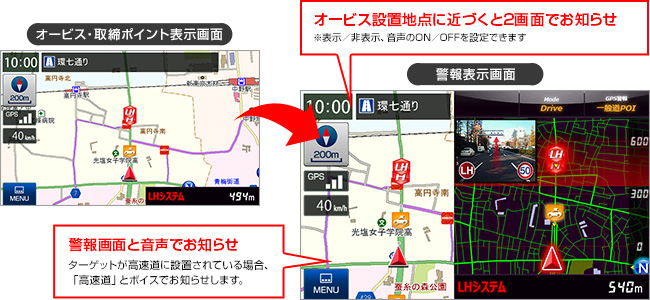 スピードの出やすい路線のオービス(自動速度取締機)設置場所、事故多発エリア、取締エリア、駐車禁止エリア、路線・高速道制限速度情報など、ユピテルオリジナルの警告・警報データを収録。アイコンや警報表示と音声案内でお知らせします。