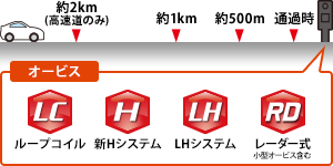 取締りの登録ポイントから約1km手前(一時停止取締のみ約100m手前)とエリア内に入ったときの2段階でお知らせします。高速道走行中の場合、オービスと同じく約2kmでもお知らせします。(一時停止取締り以外)