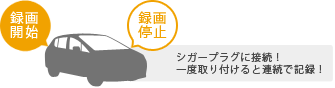 エンジン始動に連動するアクセサリー電源(シガープラグなど)に接続すれば、エンジンON/OFFに連動して自動で、記録を開始/終了します。電源をON/OFFする手間もなく、万が一の事故に備えることができます。