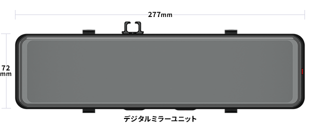 | 外形寸法 | [ミラー本体] 277(幅)×72(高さ)×21(奥行)mm [フロント] 45(幅)×39(高さ)×44(奥行)mm ※取付けブラケット(テープ貼付)装着時50(高さ)mm(窓ガラス25°想定の場合) [リア] 67(幅)×30(直径)mm ※取付けブラケット(テープ貼付)装着時43(高さ)mm(窓ガラス25°想定の場合) |