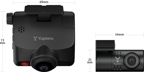 | 外形寸法 | [フロント] 69(幅)×73(高さ)×40(奥行)mm ※取付ブラケット(テープ貼付)装着時78(高さ)mm(窓ガラス25°想定の場合) [リア] 54(幅)×25(直径)mm ※取付ブラケット(テープ貼付)装着時36(高さ)mm(窓ガラス25°想定の場合) |