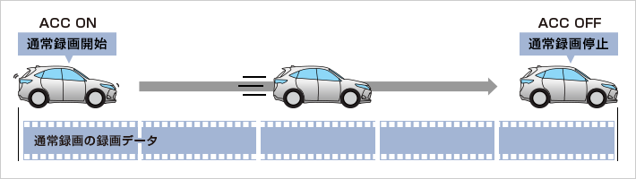 走行時の録画は、車両のACC ON/OFFに連動して自動的に記録を開始/終了します。SDカードの容量が上限に達した場合は、古い映像に上書きします。上書きをしない設定も可能です。