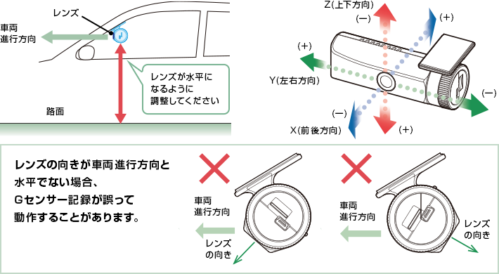 - ※GセンサーのX(前後方向)、Y(左右 方向)、Z(上下方向)の数値は、レンズの向きが車両進行方向と水平の状態で固定されています