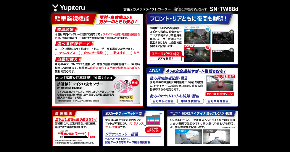 日中はもちろん、夜間にも高い記録性能を発揮します。高感度センサーSTARVISを搭載したSUPER NIGHTシリーズなら、映像が不明瞭になりがちな夕方や、深夜の住宅街など、灯りの少ないシーンでも鮮明に記録可能。またユピテル独自のノウハウで映像感度を自動調整するので、昼夜問わずクリアな映像を実現しています。