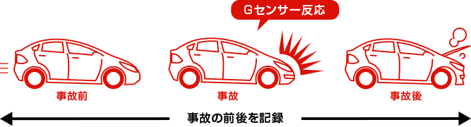 G(加速度)センサーで衝撃を検知すると、衝撃前後の映像を、上書きされないよう専用フォルダに記録します。