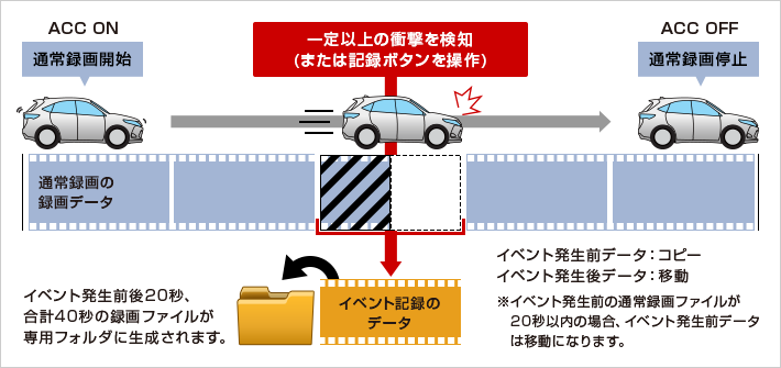 当て逃げなど衝撃を検知すると、映像を別フォルダに自動保存します。