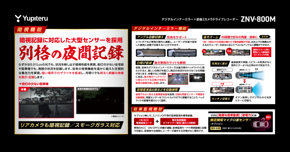 闇夜でこの明るさ。ユピテル史上最高の暗視性能。