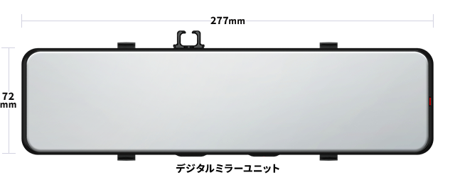 | 外形寸法 | [ミラー本体] 277(幅)×72(高さ)×21(奥行)mm [フロント] 45(幅)×39(高さ)×44(奥行)mm ※取付けブラケット(テープ貼付)装着時50(高さ)mm(窓ガラス25°想定の場合) [リア] 67(幅)×30(直径)mm ※取付けブラケット(テープ貼付)装着時43(高さ)mm(窓ガラス25°想定の場合) |