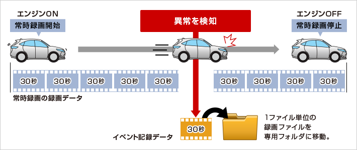 イベント記録には、Gセンサー(加速度センサー)によって一定以上の衝撃*を検知した際にその前後を記録する[Gセンサー記録]と、 記録ボタンを押してその前後を記録する[ワンタッチ記録]があります。これらのイベント記録データは常時記録で上書きされないよう専用フォルダに保存されます。