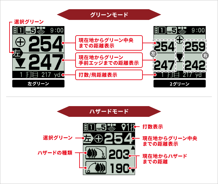グリーンやハザードまでの距離を表示する2つのモードから選択が可能。