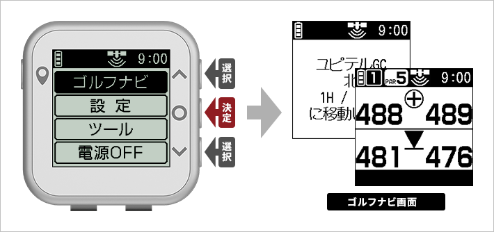 GPSによって、ワンタッチで今いるホールを検索します。手動検索も可能です。