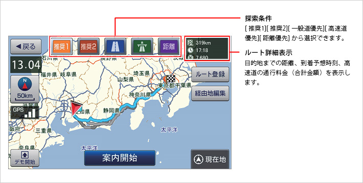 推奨1・推奨2・高速道優先・一般道優先・距離優先から状況に合わせてルートが選べます。