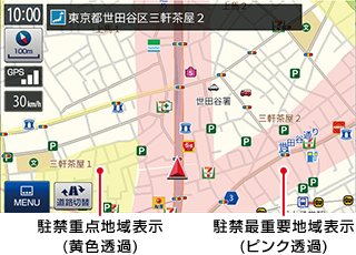 駐車禁止エリアを地図上のピンク・黄色透過でお知らせ。