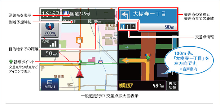 大きく見やすいイラストで表示します。さらに「100m先、大樹寺一丁目を、左方向です」と音声でも交差点名を案内します。