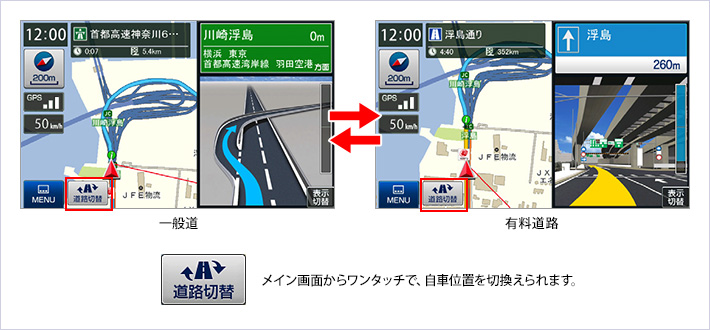 一般道/高速道が上下平行となるような場所で、道路の上下を誤認している場合はワンタッチで路線を切替えでき、誤った道案内を避けることができます。