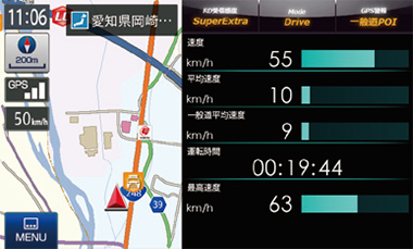 - ※地図画面の自車位置や走行速度の表示は、GPS測位に基づく表示です。OBDⅡアダプター接続時も、測位できない場所では、地図画面の自車位置アイコンや速度表示は停止し、変化しなくなります。