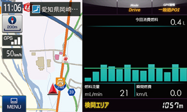 OBDⅡアダプター(OBD12-FPLⅢ) を接続すると、エンジン状態、燃費や正確な速度・走行距離などの車両情報を取得・表示!グラフィック表示できる画期的なナビゲーションに進化します!