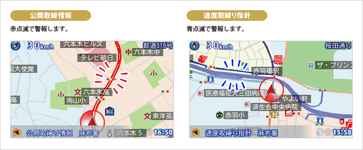 公開取締情報・速度取締り指針で取締路線が公開されている場合、その路線を点滅表示させて警報します。日付、時間、場所に合わせてリアルタイムに警報するのはSUPER CATだけ!