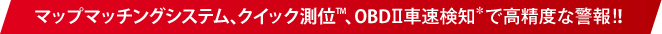 マップマッチングシステム、Gセンサー&ジャイロセンサー、別売オプションのOBD Ⅱアダプターを接続することによるOBDⅡ車速度検知により、GPS電波の受信状態が良くない場所でも、高精度な警報を行うことが可能となり、またクイック測位により測位までの時間が大幅に短縮されて、地下駐車場から地上(測位可能範囲)に出た直後などでも、付近のオービスや取締ポイントの警報を行うことができます。