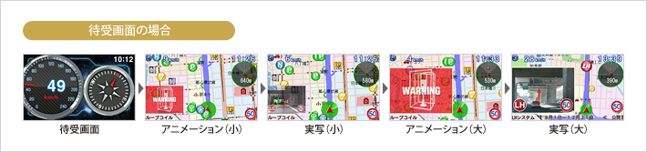 ※「マップ自動切替」設定OFFの場合、待受画面で「マップ」以外を選択していると音声とLEDのみで警報し、実写やアニメーションは表示しません。
