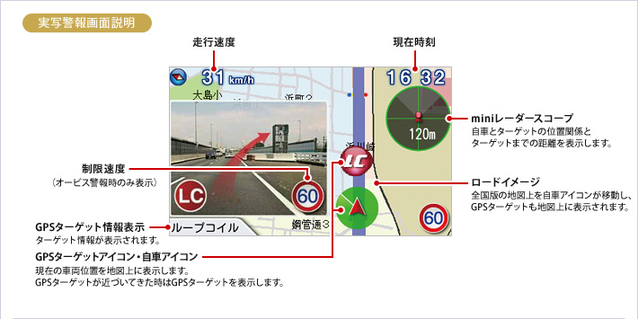 レーダー波や無線の受信とGPSデータ情報をリンクさせ、エリア内で実際に取締りが行われている可能性が高い事をお知らせします。