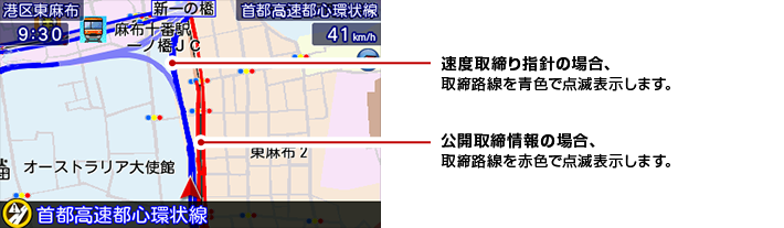 テロップ表示の他、取締路線が公開されている場合、その路線を点滅してお知らせします。[特許 第5899530号]
