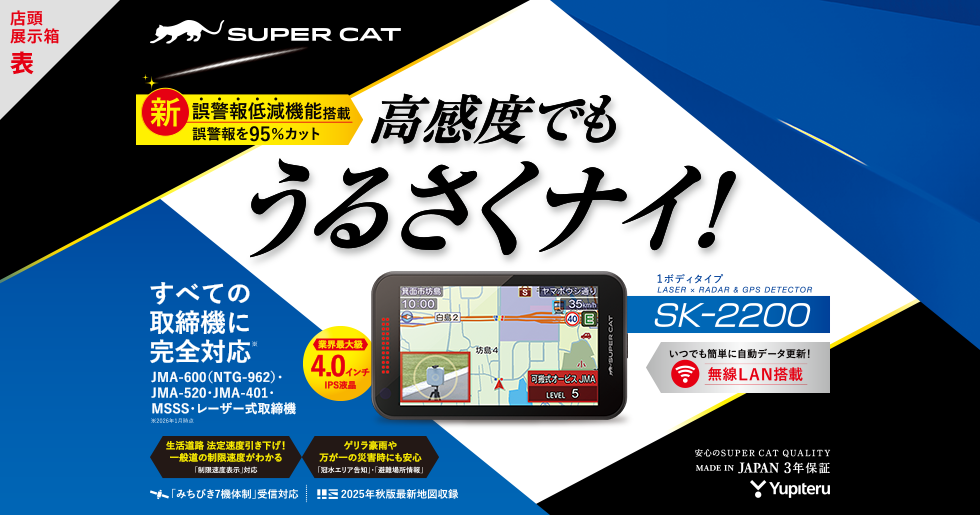 Kバンド識別性能をさらに強化。誤警報を最大95%カット。だから、高感度でもうるさくナイ。もちろん、全国で導入が進む最新取締機「JMA-600(NTG-962)」「JMA-520」「JMA-401」「MSSS」「LSM」に完全対応。