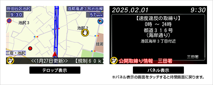 公開取締情報は、取締情報がある路線に進入した際に自動的に表示します。
