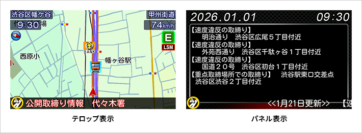 テロップ表示の他、取締路線が公開されている場合、その路線を点滅してお知らせします。[特許 第5899530号]