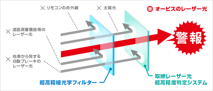 一般的に、探知範囲を広くしたり長くすると、取締レーザー光に似た妨害光の影響を受けやすくなり、誤警報が多くなります。SUPER CATは独自のフィルタと判定システムの採用で「超広範囲」「長距離」「高精度」の並立を実現しています。