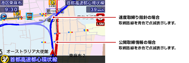 テロップ表示の他、取締路線が公開されている場合、その路線を点滅してお知らせします。[特許 第5899530号]