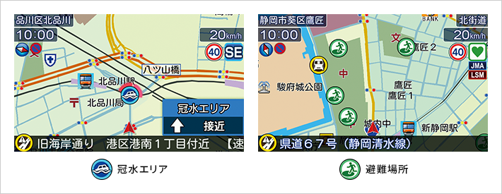 ゲリラ豪雨等により冠水が想定される場所、災害時に避難先となる避難場所をお知らせします。