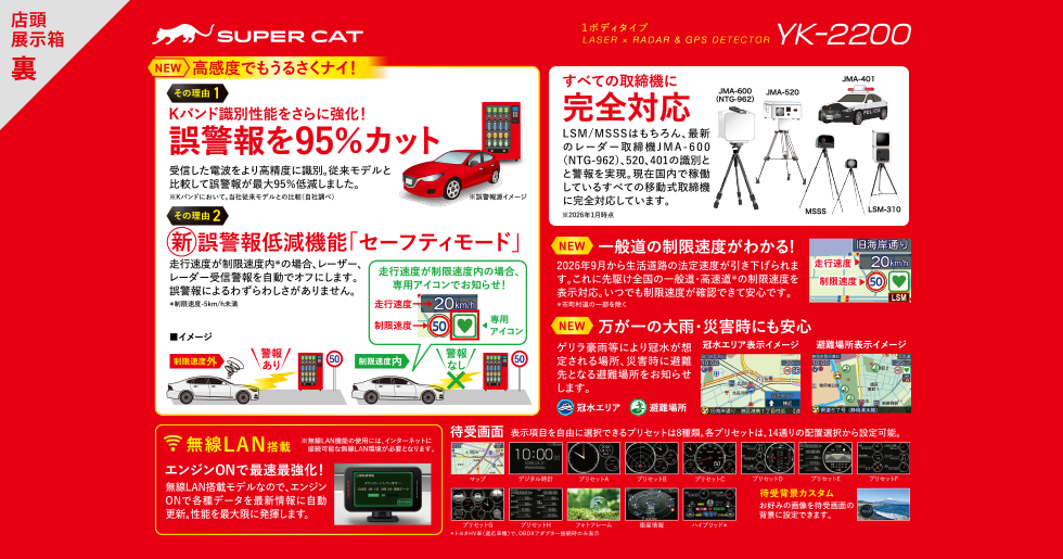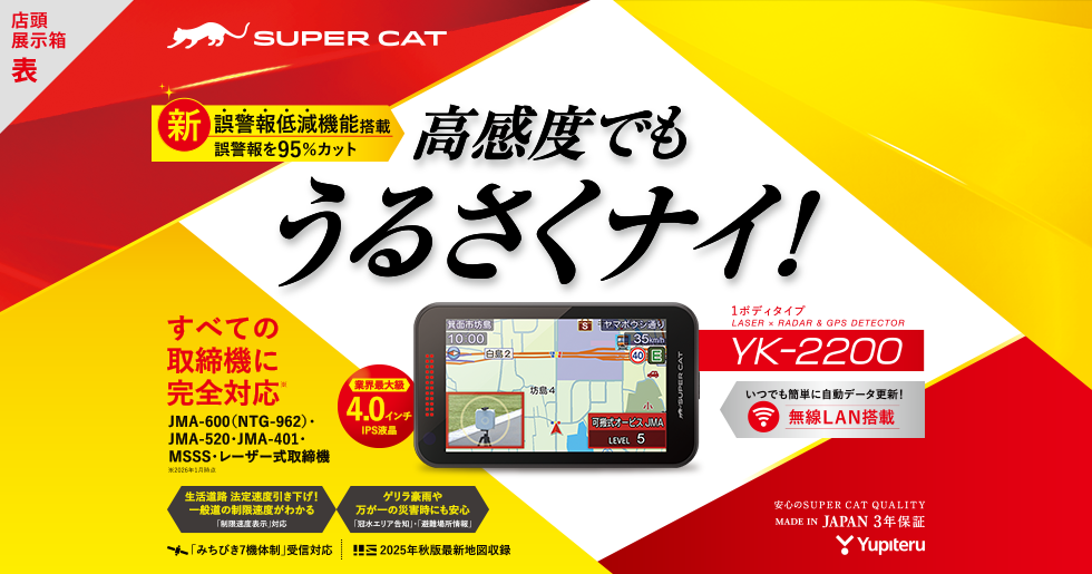 Kバンド識別性能をさらに強化。誤警報を最大95%カット。だから、高感度でもうるさくナイ。もちろん、全国で導入が進む最新取締機「JMA-600(NTG-962)」「JMA-520」「JMA-401」「MSSS」「LSM」に完全対応。