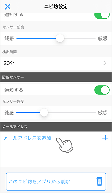 「ユピ坊は「見守りモード」「防犯モード」の際に、設定された状況に応じてアプリやメールアドレスへ通知を送信します。