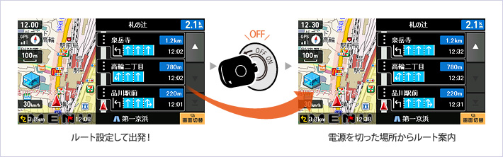 再出発(電源ON)時に引き続きルート案内を開始します。